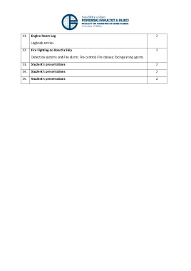 11. Engine Room Log 2 Logbook entries 12. Fire Fighting on Board a Ship 2 Detection systems and Fire alarm; Fire control; Fire classes; Extinguishing agents 13. Student’s presentations 2 14. Student’s presentations 2 15. Student’s presentations 2
