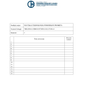 Studijski smjer NAUTIKA I TEHNOLOGIJA POMORSKOG PROMETA Nastavni kolegij TJELESNA I ZDRAVSTVENA KULTURA 4 Semestar 4 Broj sati Teme predavanja nastave 1. 2. 3. 4. 5. 6. 7. 8. 9. 10. 11. 12. 13. 14. 15.