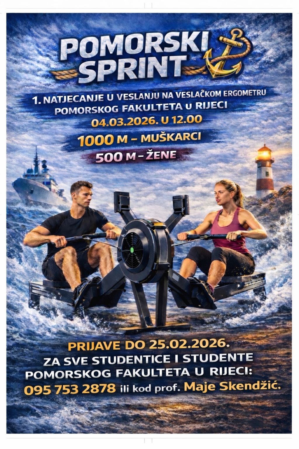 U sportskoj dvorani Pomorskog fakulteta u Rijeci, dana 4. ožujka 2026. godine s početkom u 12 sati, održat će se POMORSKI SPRINT – prvo natjecanje u veslanju na ergometru u organizaciji Pomorskog fakulteta u Rijeci, namijenjeno studenticama i studentima Fakulteta. Pravo sudjelovanja imaju svi zainteresirani studenti i studentice Pomorskog fakulteta u Rijeci. Prijave se zaprimaju najkasnije do 25. veljače 2026. godine putem SMS poruke na broj 095 753 2878 (kontakt osoba: student Ivan Mustać) ili kod prof. Maje Skendžić. Prilikom prijave potrebno je navesti sljedeće podatke: • ime i prezime • studijski program • godinu studija Natjecanje će se provoditi u sljedećim disciplinama: • studenti: 1000 m • studentice: 500 m Pozivamo sve koji žele testirati svoju izdržljivost, sportski duh i snagu – vidimo se na Pomorskom sprintu!