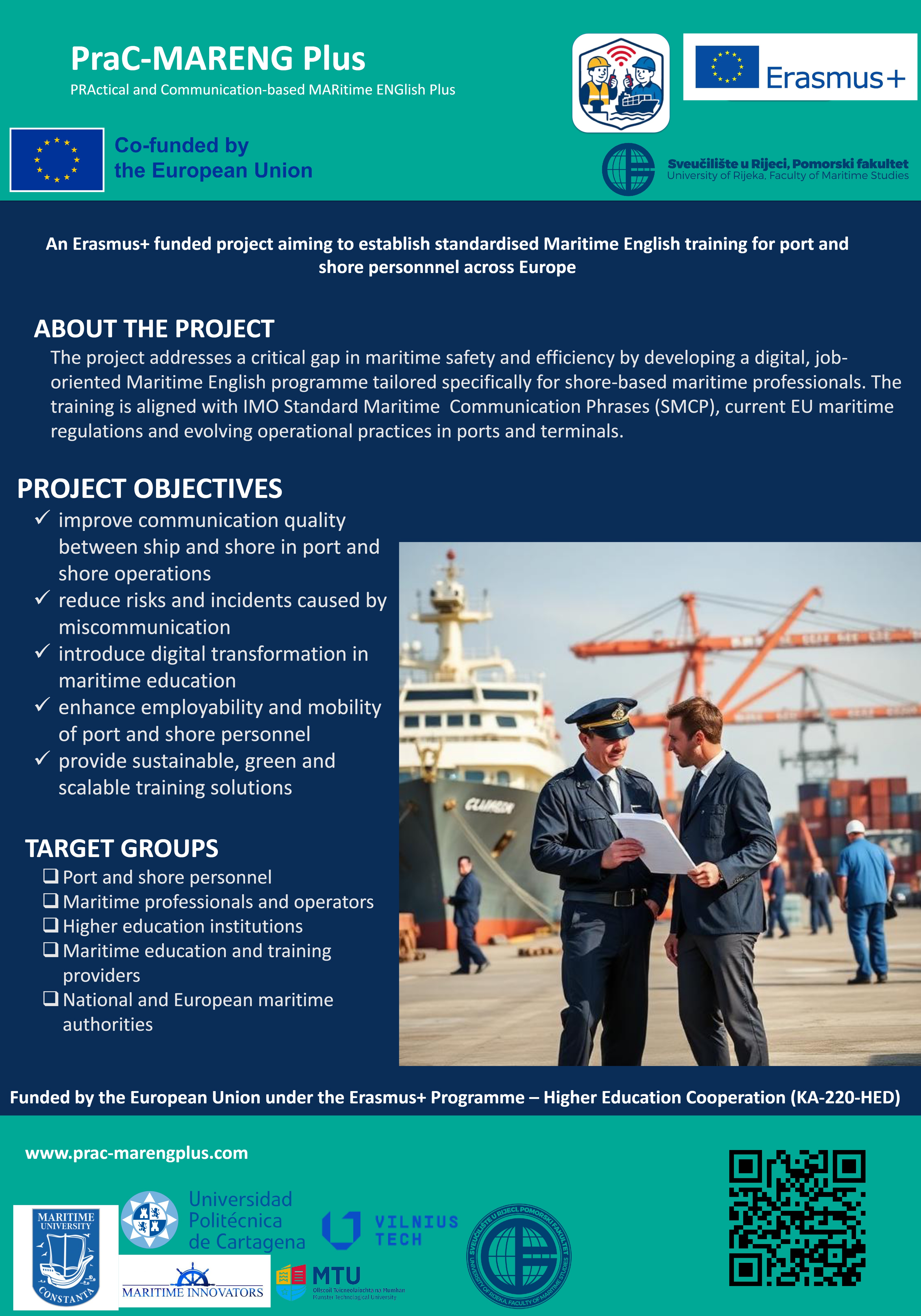 Projekt PraC-MARENG Plus – PRActical and Communication-based MARitime ENGlish međunarodni je projekt suradnje financiran u okviru programa Erasmus+ (KA220-HED). Cilj projekta jest unaprijediti znanje i praktične komunikacijske vještine iz pomorskog engleskog jezika, s posebnim naglaskom na lučko i obalno osoblje. Projekt se temelji na praktičnoj, komunikacijski usmjerenoj uporabi jezika, usklađenoj sa standardnim pomorskim komunikacijskim izrazima (SMCP), te podupire digitalnu transformaciju visokog obrazovanja i osposobljavanja u pomorstvu.