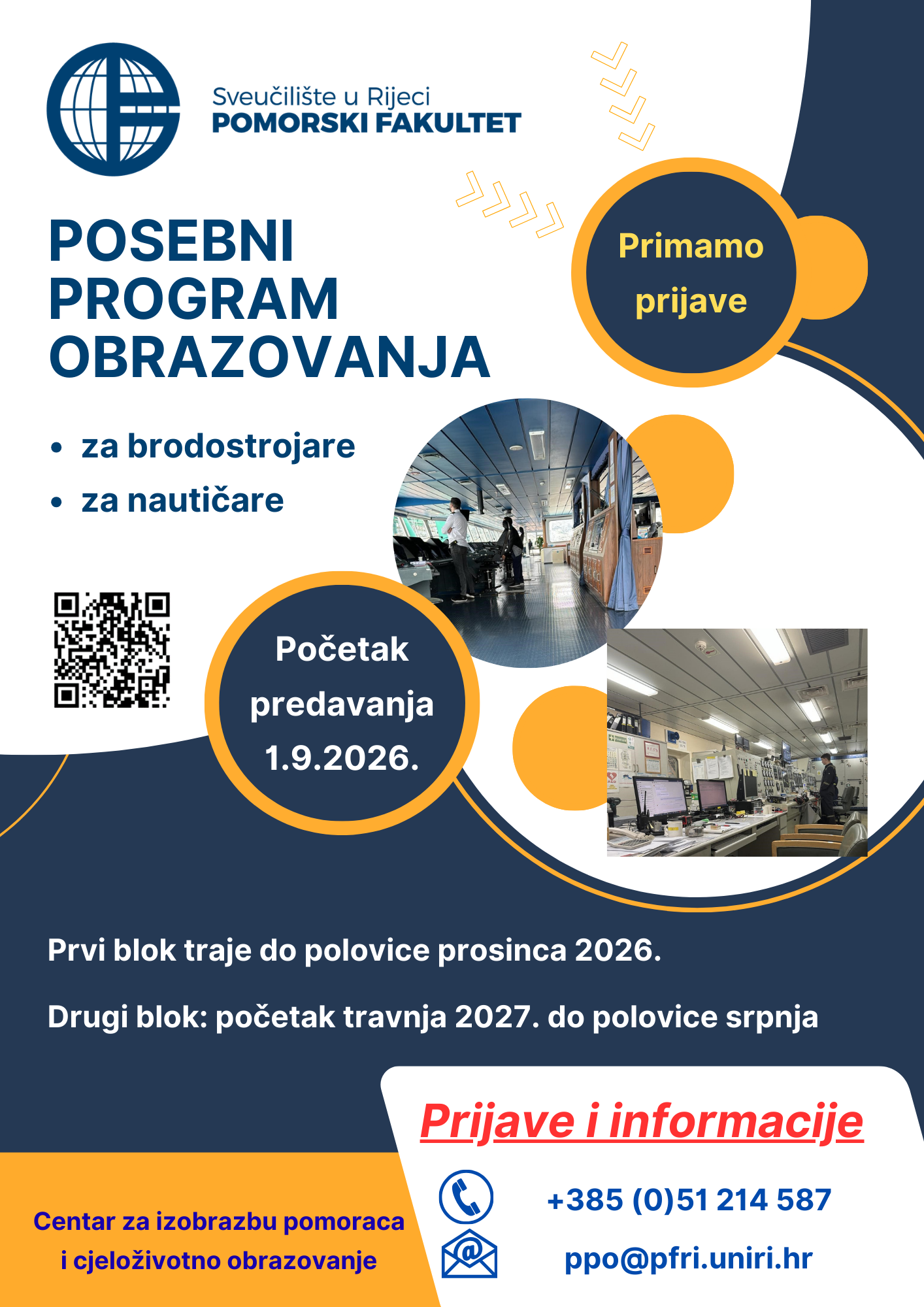 Pozivamo vas da se prijavite za novi ciklus Posebnog programa obrazovanja, za nautičare i za brodostrojare. Planirano je da predavanja počnu u ponedjeljak, 1. rujna 2026. Prvi dio programa trajat će do polovine prosinca. Početak drugog dijela bio bi 5. travnja 2027. i trajao bi do polovine srpnja 2027.